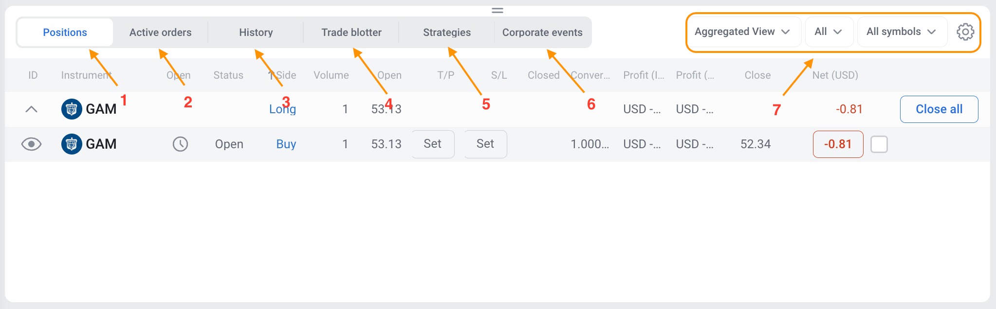 1. Positions – reflects all open positions.